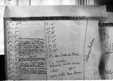 bis 15 Uhr: Wird da ein Satz sein. Die Vereinzelung als Theorem. Auskünfte an Besucher aus besseren Kreisen. Mehrere erinnerte Gesichter. Kommen als Kommissare und überprüfen mit gespielter Kennerschaft die Akteure. Treiben zum Engagement an. Noch 8 Stunden. "Sie haben noch 8 Stunden zu leben." Ereignischarakter nimmt zu. Erlebnisfähigkeit ab. Aufmerksamkeit der im weißen Zimmer um den Satz Versammelten bleibt erhalten. Deutlich das Moment des Exerzitiums. Fast alle anwesenden Literaten um meinen Tisch, wohin sie sich wieder sammeln, wenn sie zuweilen rundgingen. Wiederholung und Zyklus als literarische Kategorien. Weshalb ich wohl als einziger tatsächlich ein 24 Stunden Ereignis liefere, während die anderen eine Addition ihrer Einzelszenen geben. Bei VOSTELL in immer kleiner werdenden Schritten, weil durch die fortschreitende Aktion sein Material abnimmt. Deshalb werden Einzelphasen bei ihm stärker. Ich sehe ihn im Glas sitzen und über eine halbe Stunde hin den Arm an der Scheibe aufstrecken, um Zeichen zu geben, sich zu verständigen. Jede Aufwärtsbewegung vom anlaufenden Motor erstickt. Sein stärkstes Bild. Die anderen kann ich nicht beobachten. Von BEUYS nur Bandaufnahmen andeutungsweise wahrnehmbar. Sehe aus schiefem Winkel den Aachenfilm, den roten Faden aus BEUYS Nasenblut. Dann MORRIS mit der Tischplatte, einer ähnlichen, wie ich sie hier vor mir habe. Nach den Turnübungen scheint er belohnt zu werden: sein Dingsda liegt ausgezogen und parat auf dem Diwan im Hintergrund.