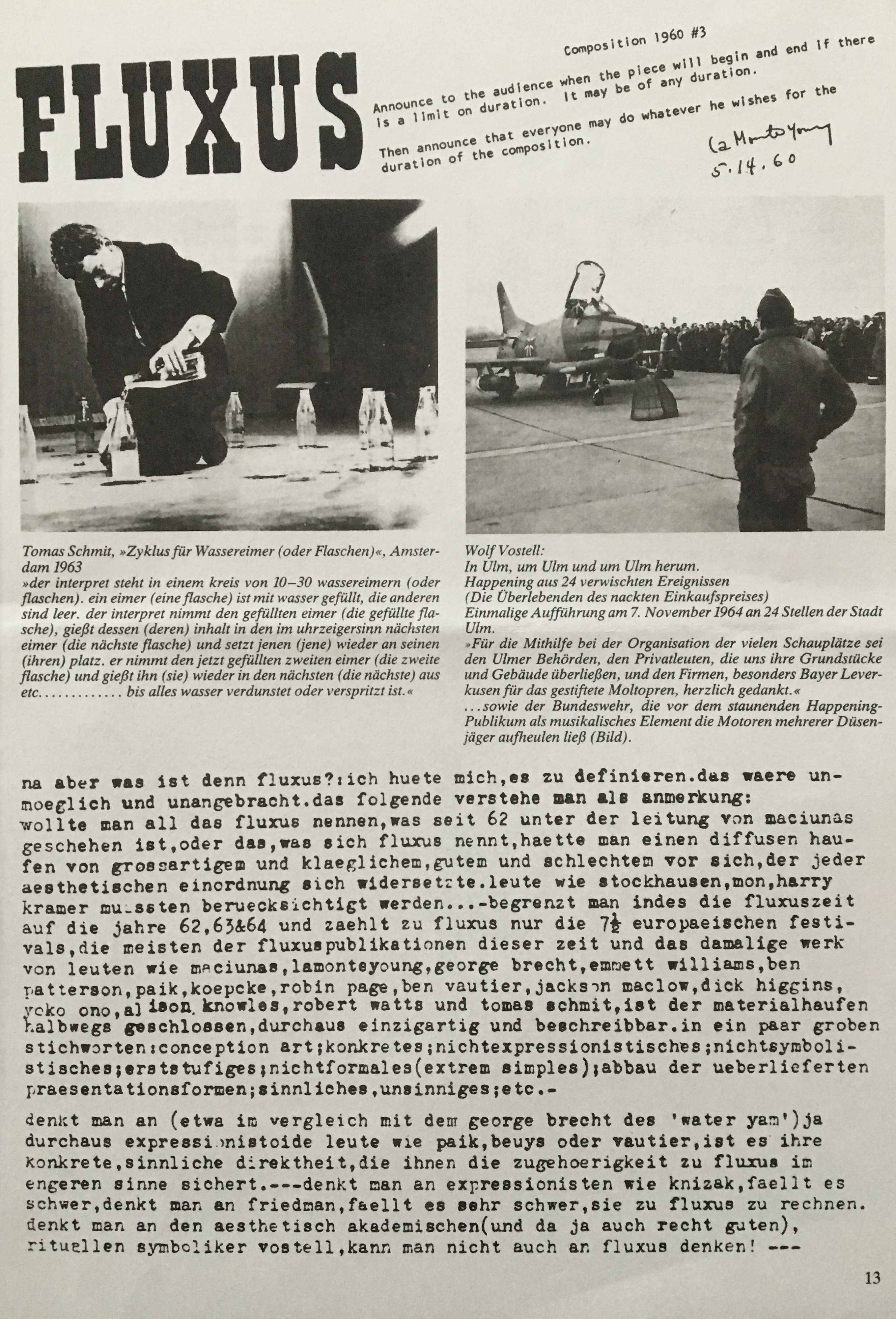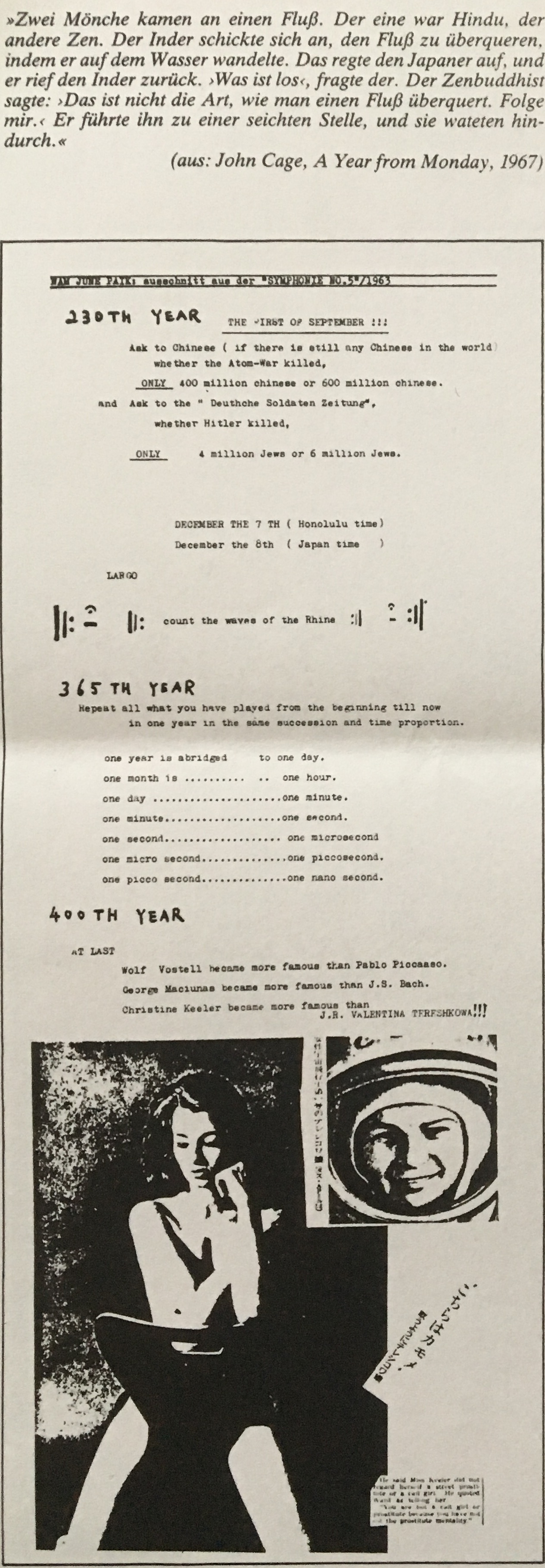 Zu den einzelnen Stichpunkten dieses Beitrags veröffentlichte Bazon Brock Originaltexte aus den sechziger Jahren in: Bazon Brock »Ästhetik als Vermittlung – Arbeitsbiographie eines Generalisten«, hrsg. von Karla Fohrbeck, 1001 Seiten mit vier Stichwortregistern.