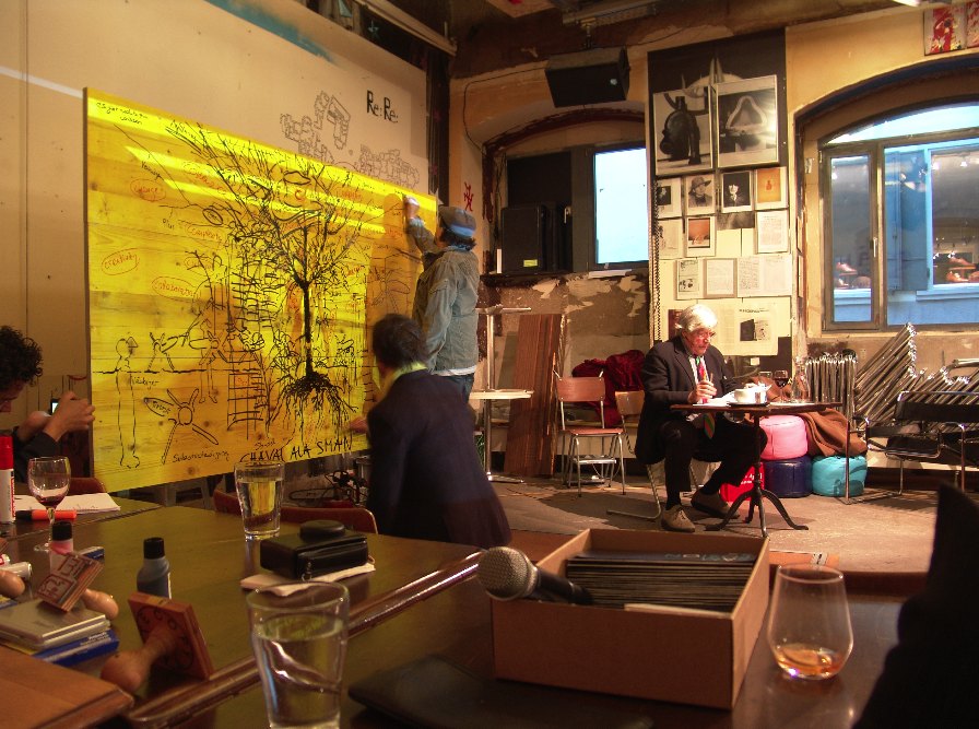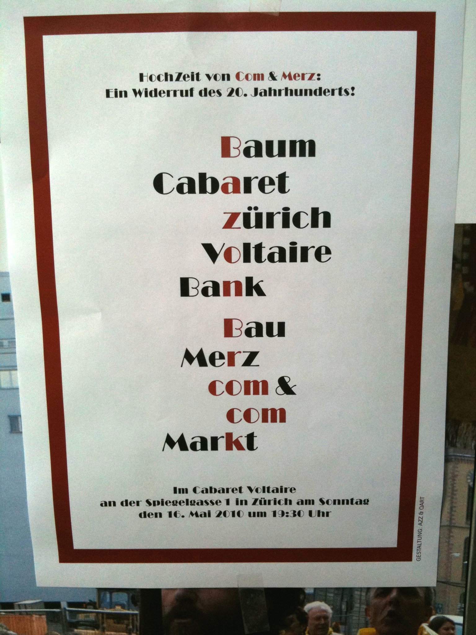 Das werden wir als Vollendung des Merz-Baus im Cabaret Voltaire demonstrieren. Com wird durch die Künstler Com&Com (Johannes M. Hedinger und Marcus Gossolt) dargestellt – den Brautführer Merz spielt Bazon Brock. Als Standesbeamter waltet Thomas Zacharias. Den neuen Bund „ComMerz“ segnet Kurt Schwitters selbst mit dem Ewigkeitssiegel TET. Die Trauzeugen und alle Hochzeitsgäste erhalten dieses Siegel zusammen mit einem Relikt des ersten Com-Baums als persönliche Grabbeigabe.