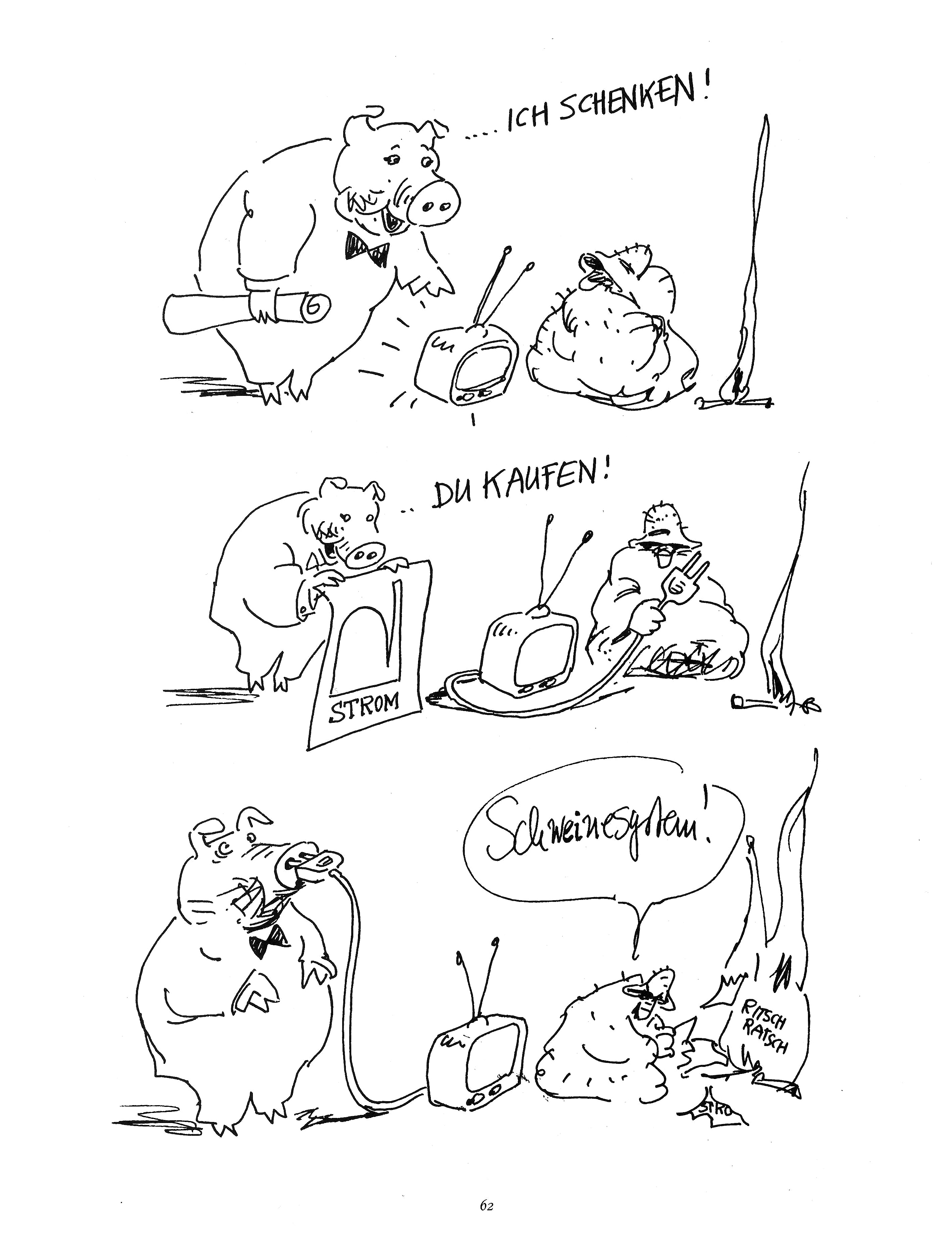 Sie sehen hier [Abb. 6], wie ein armer Idiot an einem kleinen Lagerfeuer sitzt. Hinter ihm steht der große Repräsentant einer mächtigen Organisation und sagt: „Ich schenke dir ein Fernsehgerät.“ Der Angesprochene sieht interessiert auf das Gerät, es brennt ja viel heller als sein Feuerchen! Und der Anbieter sagt: „Das Gerät habe ich dir geschenkt und jetzt kaufst du Strom!“ Das kennen wir vom Internet: Erst wird das Netz als kostenloses Kommunikationsmittel eingeführt und dann wird über die Gebühren, die erhoben werden, abkassiert – und in viel schlimmerem Maße noch über die Überwachungsinstrumente, die darin liegen. Schließlich ist das wieder Versklavung und Unterwerfung unter die Interessen der Leute, die diese Angebote machen. Und das Angebot kann ja niemand ablehnen. Die große Formulierung aus dem „Paten“ heißt: Wir machen den Menschen Angebote, die sie partout nicht ablehnen können; wenn sie ablehnen, spielen sie keine Rolle mehr, sind sozial ausgegliedert und verlieren ihre Überlebensfähigkeit. Das ist der Kern. Das macht diese Karikaturistin mit drei Strichzeichnungen klar. Zuerst wird ihm das Fernsehgerät geschenkt; im zweiten Bild fordert der Schenkende den Kauf von Strom; und im dritten ist er mit dem Urteil desjenigen konfrontiert, der sich seinem Feuer wieder zuwendet. In drei Zeichnungen ist klipp und klar gesagt, was je mit „Schweinesystem“ gemeint sein kann.