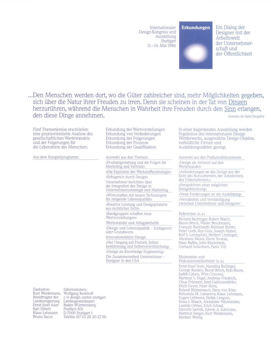 Die Landesregierung von Baden-Württemberg, Bundesrepublik Deutschland, veranst. vom 11. - 14. Mai 1986 im Kongresszentrum und Messegelände Stuttgart den Internationalen Design-Kongress mit Ausstellung "Erkundungen".