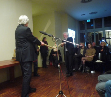 Bazon Brock und Jochen Hörisch: Experimentelle Kulturgeschichtsschreibung - Konnte Alexander den gordischen Knoten mit einem Schwert durchschneiden?, Bild: Eröffnung der Denkerei am 3.12.2011 in Berlin © Linde & François Burkhardt..