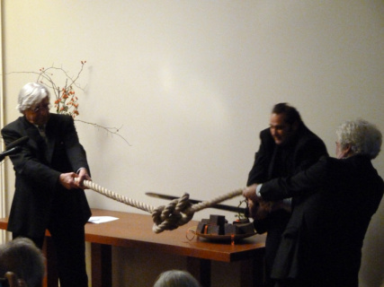 Experimentelle Geschichtsschreibung: Konnte Alexander der Große den gordischen Knoten mit einem Schwert durchschneiden?, Bild: Bazon Brock, Cem Sultuan Ungan, Jochen Hörisch | Eröffnung der Denkerei am 3.12.2011 in Berlin © Joachim Baur.