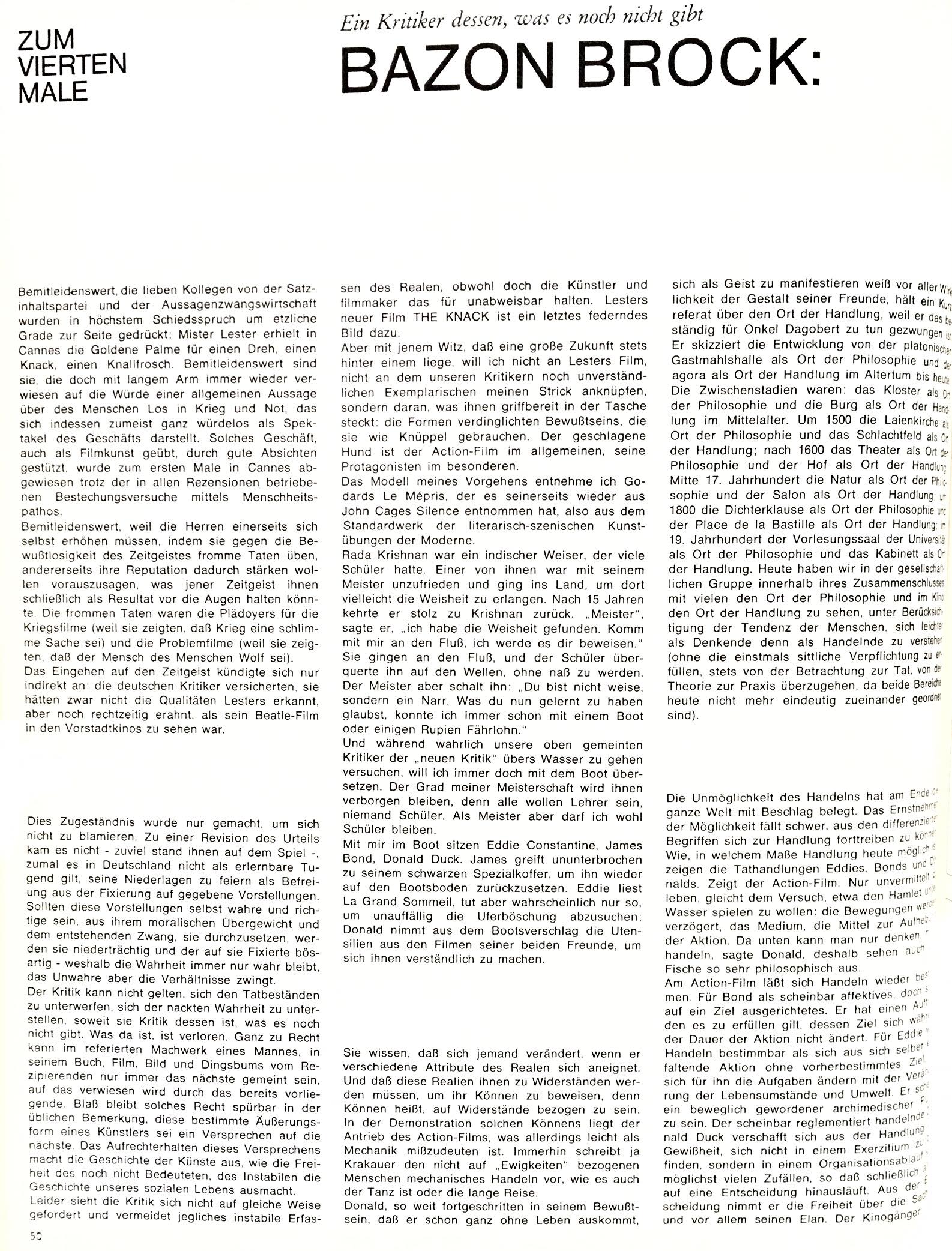 Leider sieht die Kritik sich nicht auf gleiche Weise gefordert und vermeidet jegliches instabile Erfassen des Realen, obwohl doch die Künstler und filmmaker das für unabweisbar halten. Lesters neuer Film THE KNACK ist ein letztes federndes Bild dazu.