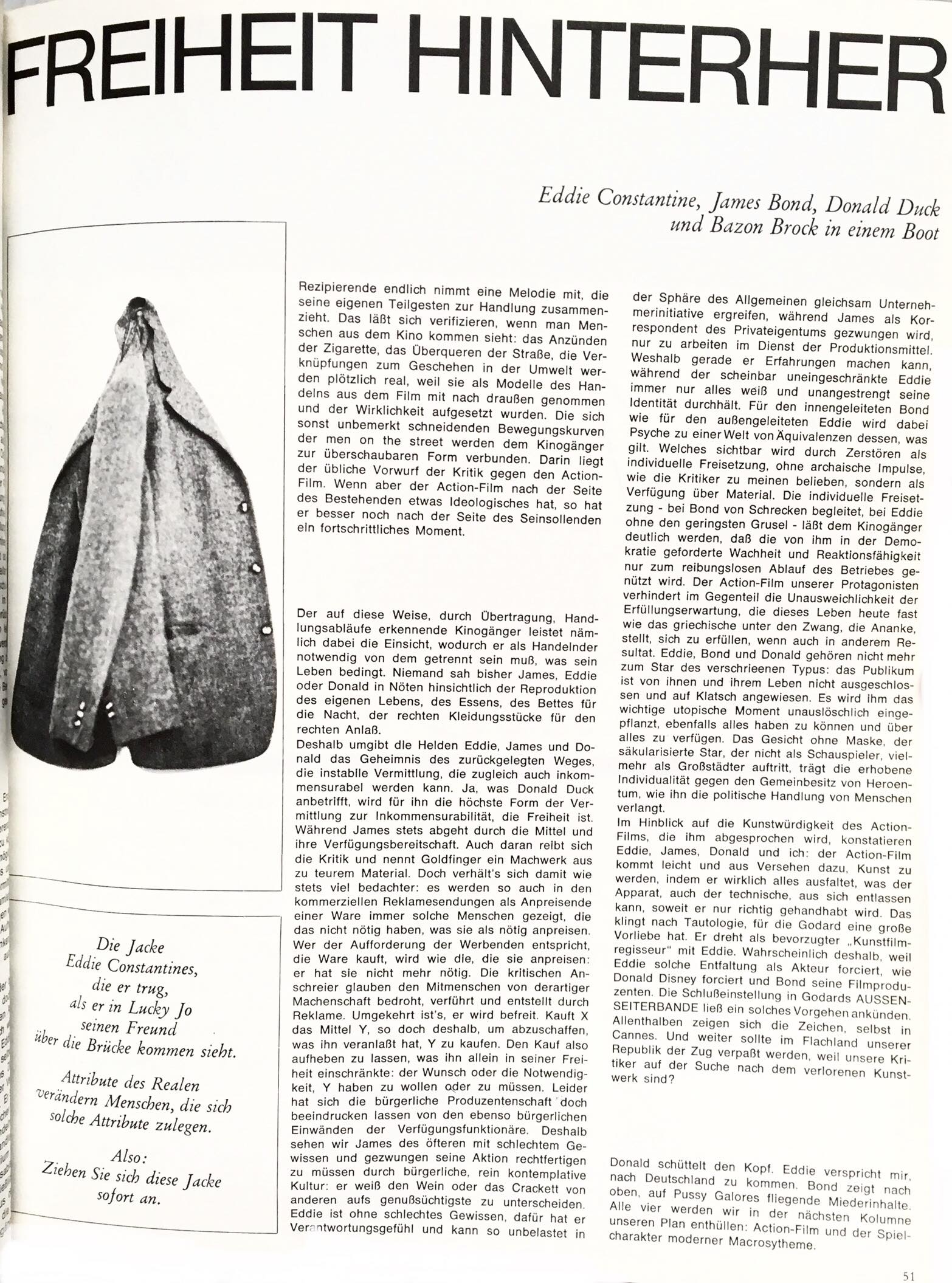 Im Hinblick auf die Kunstwürdigkeit des Action-Films, die ihm abgesprochen wird, konstatieren Eddie, James, Donald und ich: der Action-Film kommt leicht und aus Versehen dazu, Kunst zu werden, indem er wirklich alles ausfaltet, was der Apparat, auch der technische, aus sich entlassen kann, soweit er nur richtig gehandhabt wird. Das klingt nach Tautologie, für die Godard eine große Vorliebe hat. Er dreht als bevorzugter „Kunstfilmregisseur“ mit Eddie. Wahrscheinlich deshalb, weil Eddie solche Entfaltung als Akteur forciert, wie Donald Disney forciert und Bond seine Filmproduzenten. Die Schlußeinstellung in Godards AUSSENSEITERBANDE ließ ein solches Vorgehen ankünden. Allenthalben zeigen sich die Zeichen, selbst in Cannes. Und weiter sollte im Flachland unserer Republik der Zug verpaßt werden, weil unsere Kritiker auf der Suche nach dem verlorenen Kunstwerk sind?