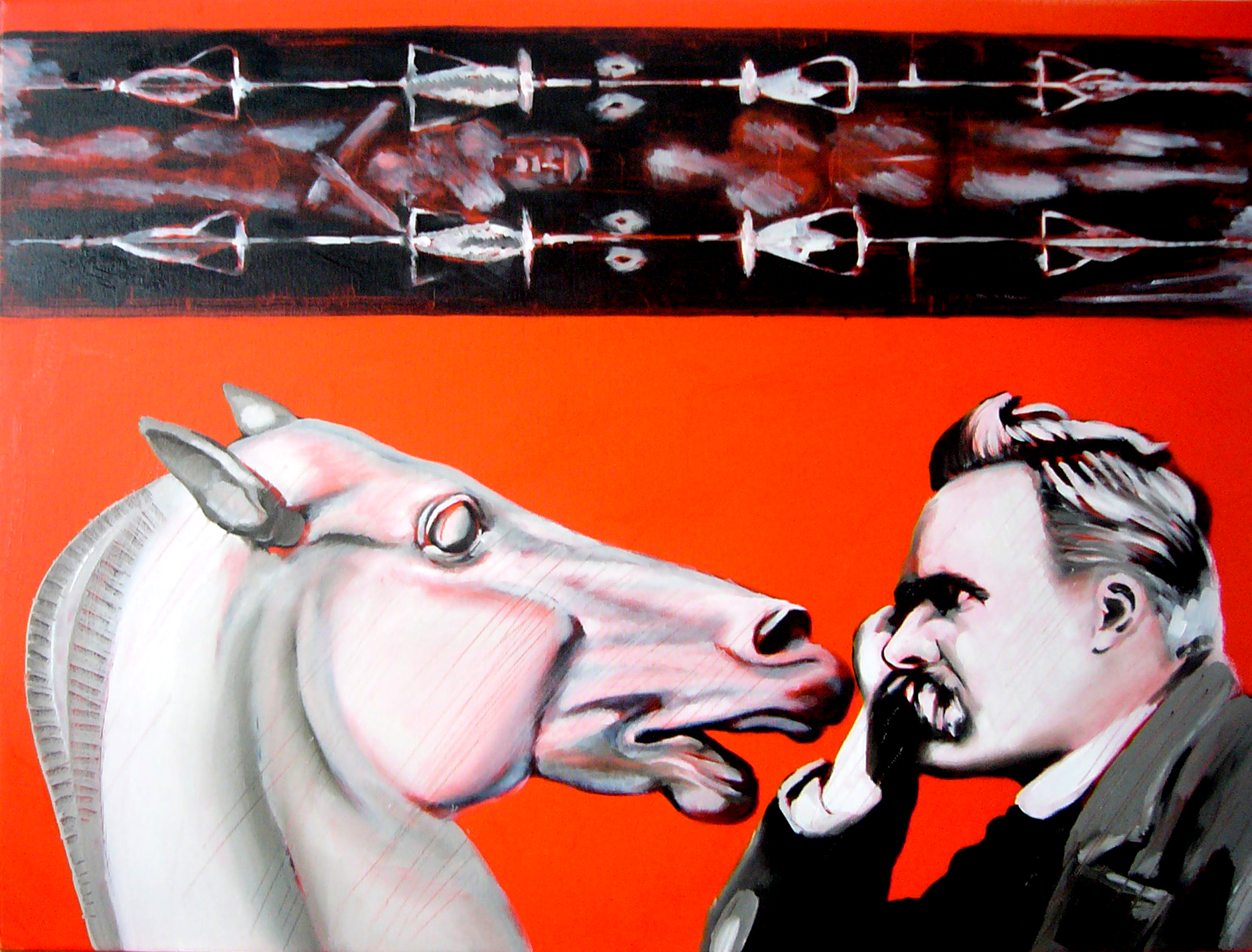Aristoteles, der von Gerpillis geritten wird, und das Schwein – das soziale Tier. Platon, die freie Pythia, die die Stadt kompensiert und das gerupfte Huhn mit den dreieckigen Eiern. Der vor Publikum onanierende Diogenes und der Pawlowsche Hund. Nietzsche, Lou Salome und das Pferd.