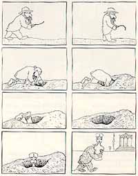 Wir stehen immer noch in dem schon lange zerstörten Museum für Archäologie und Ethnologie, beides Wissenschaften, in denen der Begriff Feldforschung eine wichtige Rolle spielt. Feldforschung heißt, das Museum, das Lehrgebäude verlassen, um am Ort selbst etwas über diesen, aber auch über die eigene Person zu erfahren. Begehung als Beschwörung: Man verspricht ungeteilte Aufmerksamkeit: Erlebnisströme sollen über die gewohnten Grenzen fließen. Vielleicht ist es der Archäologe mit der Wünschelrute, solange er die Vergangenheit nicht an sich reißt, denn dann hört sie auf zu leben, das heißt, sie entvölkert sich und wird museal.