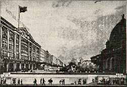 Er hat noch keine Kenntnis davon, daß im Hotel Excelsior sich nicht nur eine großartige Halle, in welcher nachmittags und abends große Konzerte statffinden, ein erstklassiges Weinrestaurant, eine intime Bar ein Spezialausschank "Zum Bürgerlichen Bräuhaus Pilsen" (Pilsner Urquell) eine Bols-Likör-Stube, ein Münchner Bierkeller (Zum Thomasbräu-Keller, 1500 Personen Sitzfläche, eine Sehenswürdigkeit Berlins) Zur Stadtschänke, 500 Personen Sitzfläche, ein bahnamtliches Fahrkartenbüro, eine Hotelbibliothek, sondern auch eine eigene Schneiderei, Schusterei, Wäscherei, Tischlerei, Fleischerei, Bäckerei, Konditorei Druckerei, Buchbinderei befindet. (72)