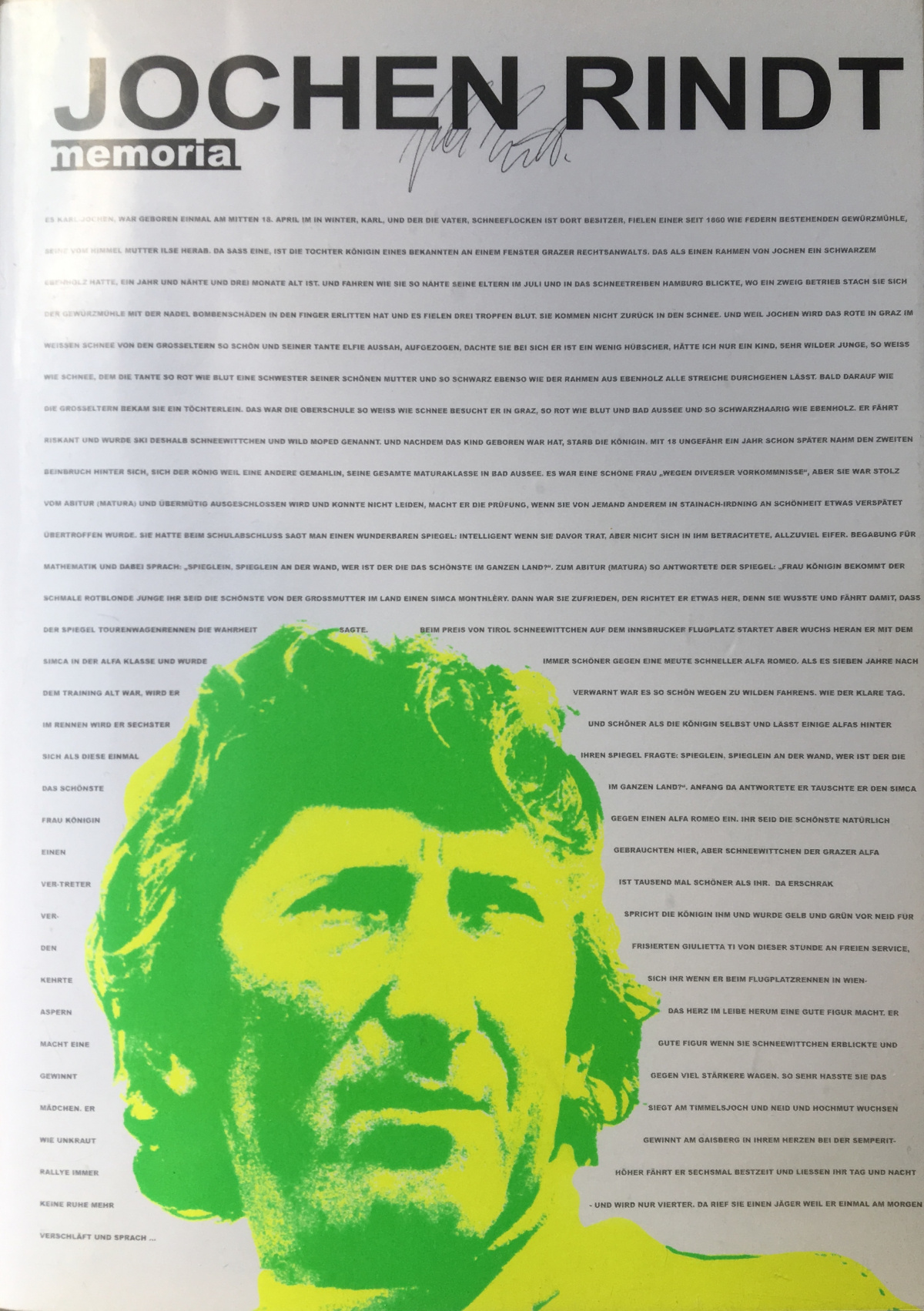Es steht geschrieben, Jochen Rindt genieße noch immer eine Verehrung wie vor 40 Jahren. Damit diese Behauptung nicht als Medienmache, als popige Nekrophilie und Bravo-Ruf aus dem Teeniezimmer abgetan werden kann, sollten wir alles daran setzen, die Behauptung, Jochen Rindt lebt, zu bestätigen – und das um so nachdrücklicher, als die Mühen für das Fortleben der Toten in jeder Kultur aller Zeiten als die vornehmste Verwirklichung des Menschseins gelten.