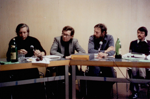 Kongress "Lebensformen der Zwanziger Jahre", Bild: Nicolaus Sombart, Ekkehard Hieronimus, Harald Szeemann, Ulrich Linse. Internationales Designzentrum Berlin, 05.-09.10.1977. Foto: Linde Burkhardt..