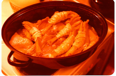 Gänsefüße werden gebrüht und abgezogen. Krallen werden abgeschnitten. Die weißen guten Därme von Gänsen werden ausgeschabt, gewaschen, mit Salz und etwas Essig gerieben, wieder gewaschen und ausgeschabt, wieder gewaschen usw. bis sie ganz sauber sind.