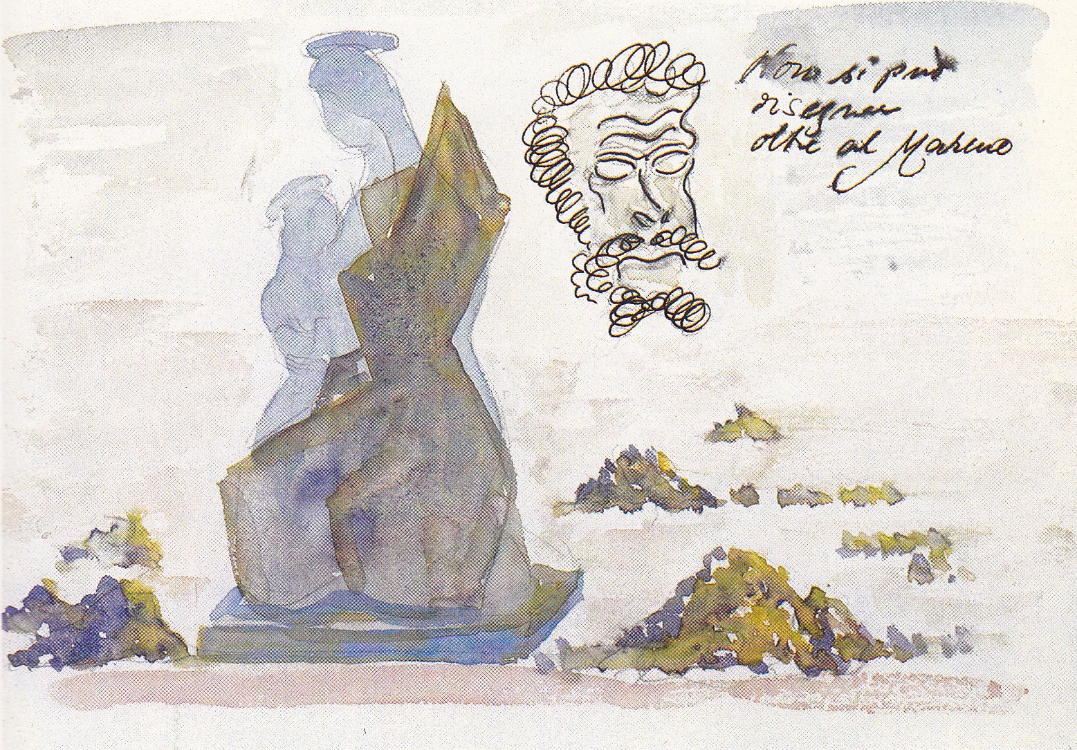 Das Blatt zeigt das Portrait Michelangelos und die Inschrift »non si puo disegnare oltre al marmo« über ein paar Häufchen aus Marmorsplittern, im Ungefähren schwebend.