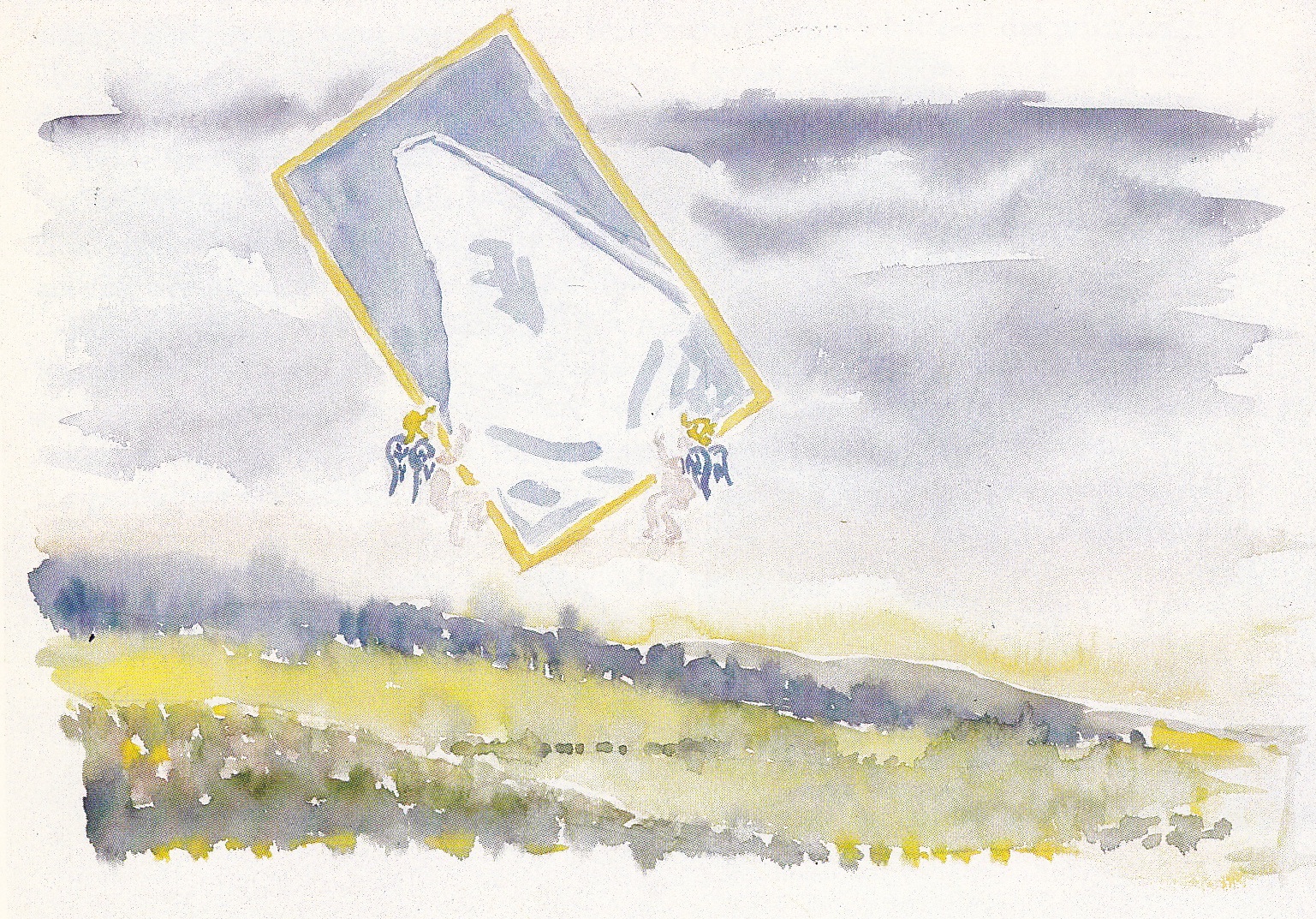 Aquarell 14 schlägt uns in augenzwinkernder Analogie zu antiken Vergegenwärtigungstechniken als akzeptable Minimalintervention für die Reise in die Ferne etwa Folgendes vor: der norddeutsche Heidebewohner (das signalisiert die Architekturtypik der dargestellten Häuser) bräuchte nicht zu verreisen, wenn er in der Lage wäre, statt dessen öfter mal das Thema zu wechseln. Die über dieser Landschaft nach antikem Vorbild schwebende Nike oder Viktoria bedeutete einen wirklichen Sieg der Phantasie, wenn der Heidebewohner seine Sehnsucht nach Kandergrund vor Matterhorn so stillte, wie der antike Mensch seine Sehnsucht nach Dauer und Größe, nach Taten für das Gemeinwohl und die daran geknüpfte Garantie ewiger Erinnerung befriedigte.