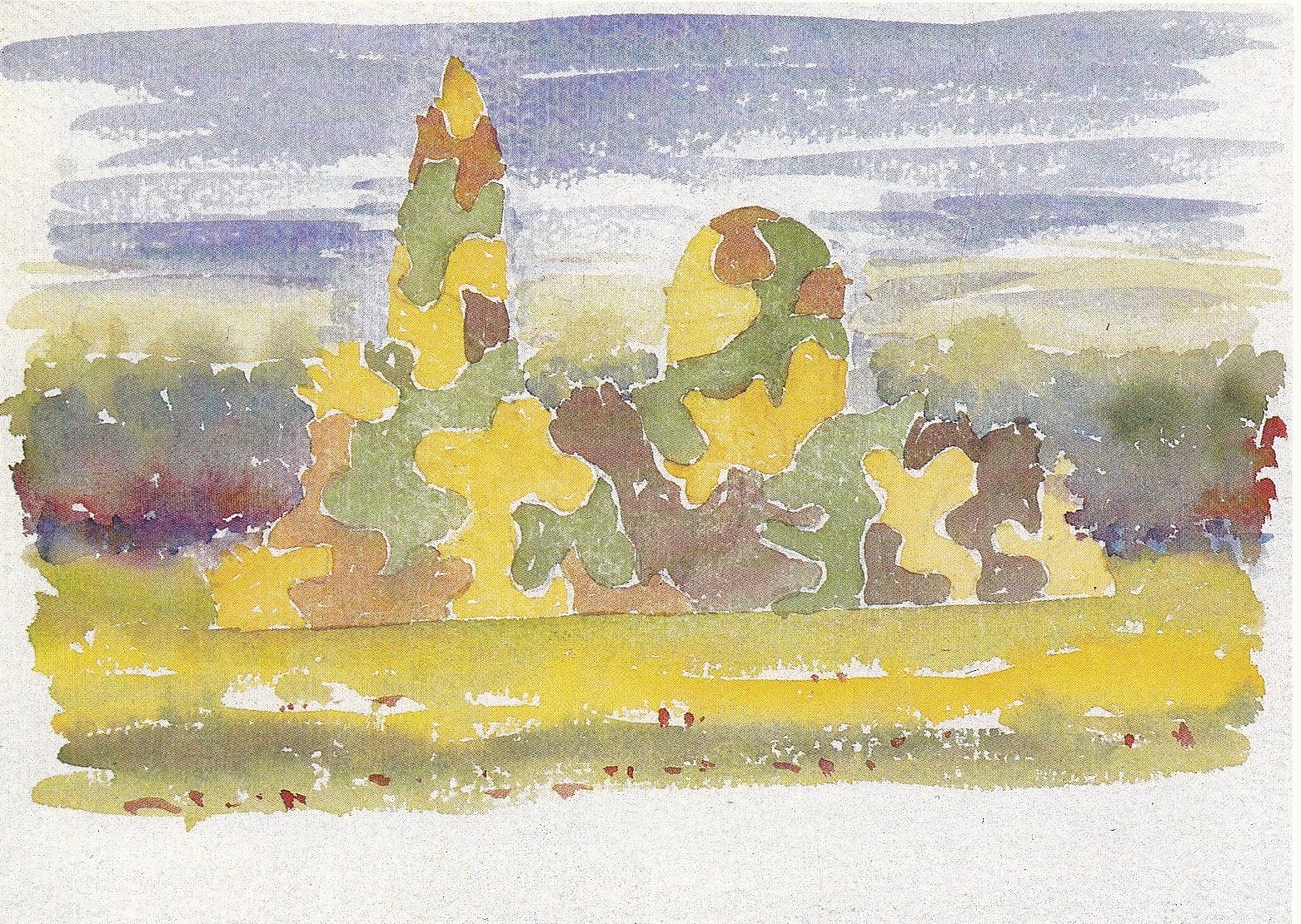 Aquarell 8 bringt den in Nr. 7 unbestimmten Hintergrund ins Spiel. Die Unterscheidung von Vordergrund, Mittelgrund und Hintergrund ist im Laufe der Entwicklung von Abbildungen entstanden und von der Struktur der Abbildungen auf das ursprünglich Abgebildete übertragen worden, so daß wir inzwischen auch bei einem Blick in eine Landschaft unsere Orientierung an der Unterscheidung zwischen Vorder-, Mittel- und Hintergrund festmachen.