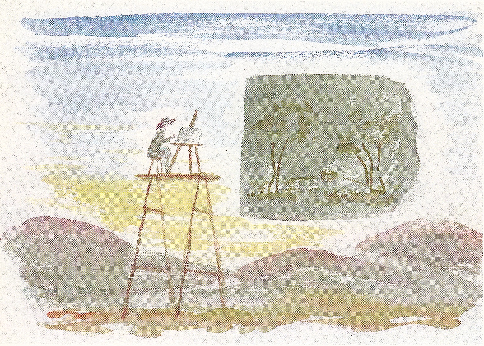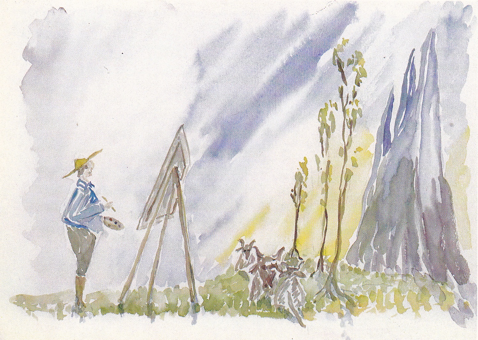 Das Aquarell zeigt einen Maler in Pfadfinderkostüm vor einer in der Landschaft aufgestellten Staffelei mit Leinwand. Der Maler erblickt vor sich im Bildvordergrund ruhendes Milchvieh, im Bildmittelgrund artig gereihte Bäume, im Bildhintergrund steil aufragende Felsen wie Drillingskinder des Matterhorns.