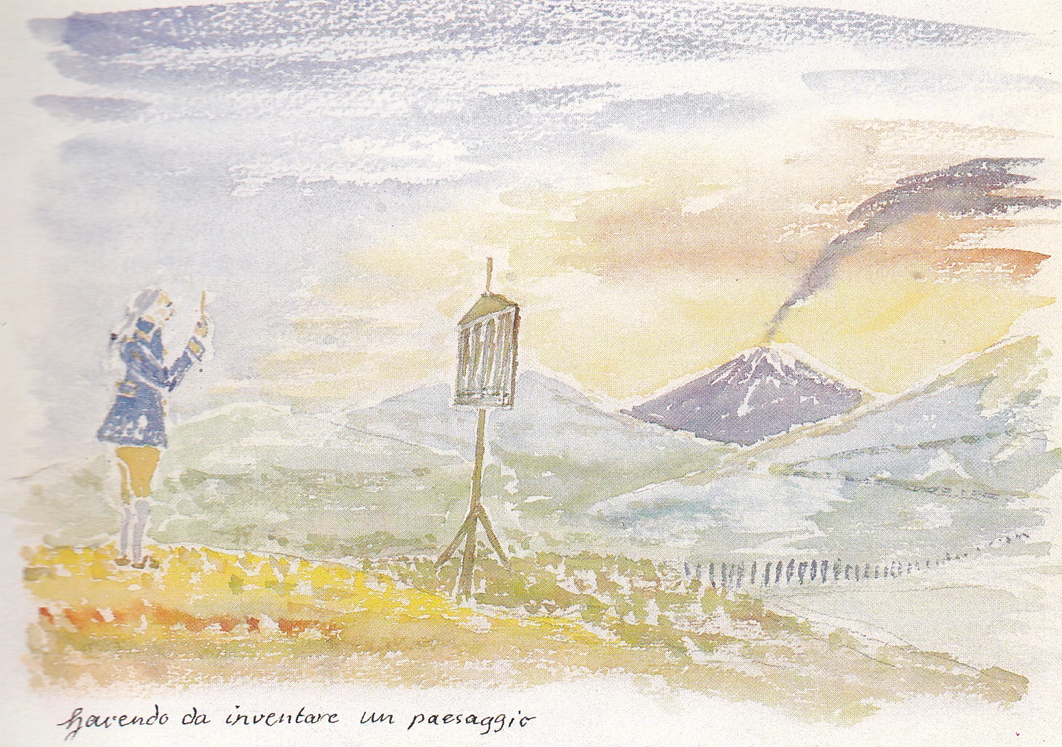 Aquarell 11 zeigt einen im Stil des 18. Jahrhunderts gewandeten Künstler in der Gegend um den rauchenden Vesuv. Der Künstler winkelt seinen rechten Arm so an, daß sich der Bleistift in seiner rechten Hand genau in Augenhöhe befindet. Wir identifizieren die Geste als einen notorischen Versuch von Landschaftsmalern, die Maßstäblichkeit ihrer Malereien gegenüber der dargestellten Natur zu sichern.