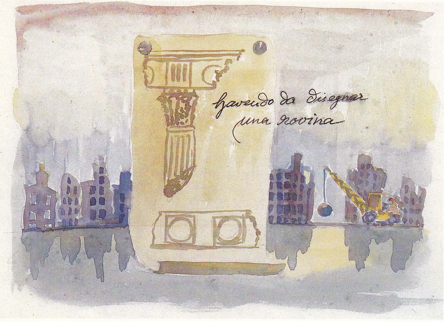 Im Bildvordergrund sehen wir – als Augentäuschermalerei dargestellt einen mit Reißzwecken in den Bildträger gepinnten Entwurf einer ruinösen korinthischen Säule, auf der (auch das ist im Sinne der historischen Korrektheit totaler Abfall) ein dorischer Architrav mit alternierenden Schlitz- und Bildfeldern (Triglyphen und Metopen) aufruht. Auf demselben Blatt weiter unten der Aufblick auf die Säulenbasis. Die Pinnwand verwandelt sich in einen aquarellierten Ereignisraum, der durch eine Häuserzeile definiert ist, vor der sich von rechts gerade ein Bagger mit jener berüchtigten Abrißkugel ins Bild schiebt.