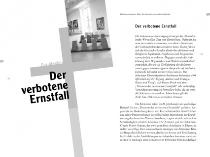 Die bekannteste Erzwingungsstrategie des Absoluten heißt: Wir wollen Gott und damit basta. Weltweit hat man inzwischen verstanden, was dieser Fanatismus der Gottsucherbanden anrichten kann. Dabei fühlen sich die Gottsucherbanden durch ihre Kulturen und Religionen legitimiert, Prophetien und Programme wortwörtlich zu nehmen. Dagegen wurde die Aufklärung über Dogmatiken und Wahrheitsradikalität entwickelt, die wir als Zivilisierung der Kulturen zuerst gegen unseren eigenen Anspruch auf exklusive kulturelle Identität vorantreiben müssen. Der Schweizer Oberstdivisionär Bachmann bekundete 1998 öffentlich auf der Tagung „Kultur und Strategie, Kunst und Krieg“, daß Bazon Brock mit dem „Theorem des verbotenen Ernstfalls“ alle zukünftigen Verteidigungsstrategien formuliert habe, die als erste die Schweizer anwandten. Schon heute gilt die Null-Tote-Doktrin in westlichen Armeen.