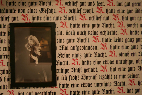 Im Theoriegelände zeigen wir den historischen Experimentalraum für die Selbstentfaltung der deutschen Heimatsucher. Bei dieser Versuchsanlage handelt es sich um die phantasiegetreue Simulation der Wohnung von Ludwig Derleth (1870-1948). Man findet in dieser Inszenierung ausgesuchte Einrichtungsgegenstände, wie zum Beispiel altarartige Aufbauten mit Heiligenfiguren und Kandelabern, eine Betbank, einen Diwan, einen Rundtisch mit gelb polierter Platte, auf der ein Adler eingebrannt ist, und eine Gipssäule mit Altardecke, auf der Brot und Wein präsentiert werden. An den Wänden, unter anderen Photographien, fällt bei einem Photographierten die zur Schau gestellte Pose und Mimik auf, die in unterschiedlichen Ausprägungen an berühmte Darstellungen Dantes, Goethes oder Wagners erinnern. Der Photographierte ist der Großdichter Stefan George, der seinen Bezugsgrößen entsprechend Wirkung zu erzielen versuchte. Sein geistiger Zögling, Ludwig Derleth, gestaltete am Karfreitag 1904 seine Dachkammer zu einem Versammlungsort um, an dem sich bei Kerzenlicht eine Schar von George-Jüngern und anderen persönlich eingeladenen Münchnern einfand. Auch der Schriftsteller Thomas Mann war unter den etwa zwölf extravaganten Geistesdienern, die zu Teilnehmern an einer feierlichen Séance wurden; heute würde man „Performance“ sagen. Mann schildert in seiner Novelle „Beim Propheten“ (1904) erinnerungsgenau, wie sich die effektvolle Einrichtung auf die Besucher auswirkte und was sich in der Bohèmebehausung des „Daniel Zur Höhe“ zutrug; so lautete karikaturhaft der Name Derleths später bei Thomas Mann. (3)