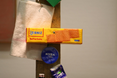 Der deutsche Narr mußte als armer Schlucker und Pilger stets anderen Menschen sich verständlich machen, nach dem Weg fragen, und hatte deshalb frühzeitig Langenscheidts Taschenwörterbuch, das erste seiner Art, dabei. Desweiteren transportierte er in seinem Rucksack eine wiederverschließbare Flasche, meist mit Bier gefüllt, das nach dem deutschen Reinheitsgebot von 1516 gebraut war. Das Prinzip gründlicher Reinheit und Rationalität berücksichtigte der ewige Wanderer ohnehin, mußte er doch auf kleinsten Raum seine gesamte Existenz organisieren. Solch eine Lebensform läßt die fixe Idee entstehen, auf der Flucht stets Autarkie bewahren zu wollen. Diesem Verlangen entsprechen bestimmte Produkterfindungen, die weltweit Synonyme für das Deutschsein geworden sind: Uhu-Alleskleber, Tesa-Film, Tempo-Taschentuch, Nivea, Odol und Leibniz-Keks in entsprechend gestalteter Verpackung.