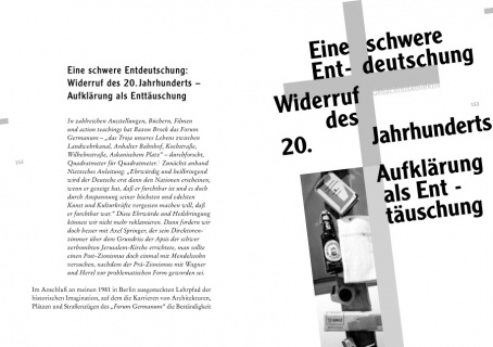 In zahlreichen Ausstellungen, Büchern, Filmen und action teachings hat Bazon Brock das Forum Germanum – „das Troja unseres Lebens zwischen Landwehrkanal, Anhalter Bahnhof, Kochstraße, Wilhelmstraße, Askanischem Platz“ – durchforscht, Quadratmeter für Quadratmeter. (1) Zunächst anhand Nietzsches Anleitung: „Ehrwürdig und heilbringend wird der Deutsche erst dann den Nationen erscheinen, wenn er gezeigt hat, daß er furchtbar ist und es doch durch Anspannung seiner höchsten und edelsten Kunst und Kulturkräfte vergessen machen will, daß er furchtbar war.“ Diese Ehrwürde und Heilsbringung können wir nicht mehr reklamieren. Dann fordern wir doch besser mit Axel Springer, der sein Direktorenzimmer über dem Grundriss der Apsis der schwer zerbombten Jerusalem-Kirche errichtete, man sollte einen Post-Zionismus doch einmal mit Mendelssohn versuchen, nachdem der Prä-Zionismus mit Wagner und Herzl zur problematischen Form geworden sei.