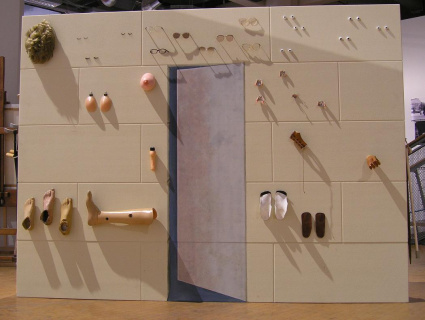 Im Theoriegelände zeigen wir die auf die Leistungen des großen preußischen Baumeisters Karl Friedrich Schinkel zurückverweisende Fake-Wand, der verschiedene Objekte appliziert sind, die den Betrachter mehr oder weniger peinlich an heutige Anpreisungen von Schönheitschirurgie am weiblichen wie männlichen Körper und an plastische Chirurgie zur Wiederherstellung von Körpern nach Deformationen durch Krankheiten und Unfälle denken lassen.