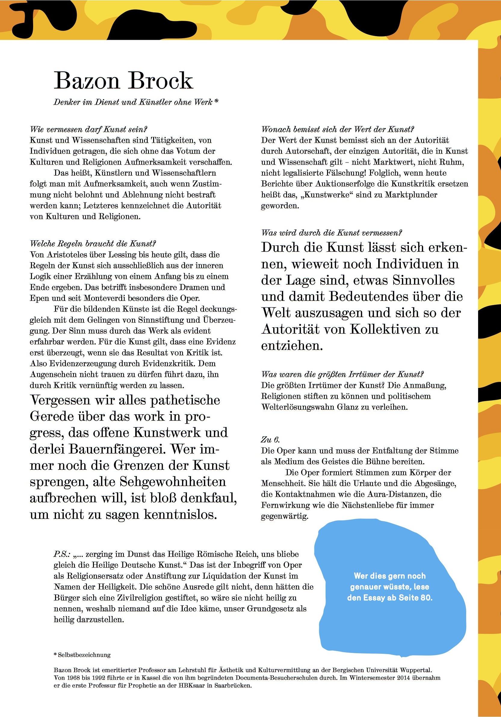 Vergessen wir alles pathetische Gerede über das work in progress, das offene Kunstwerk und derlei Bauernfängerei. Wer immer noch die Grenzen der Kunst sprengen, alte Sehgewohnheiten aufbrechen will, ist bloß denkfaul, um nicht zu sagen kenntnislos.