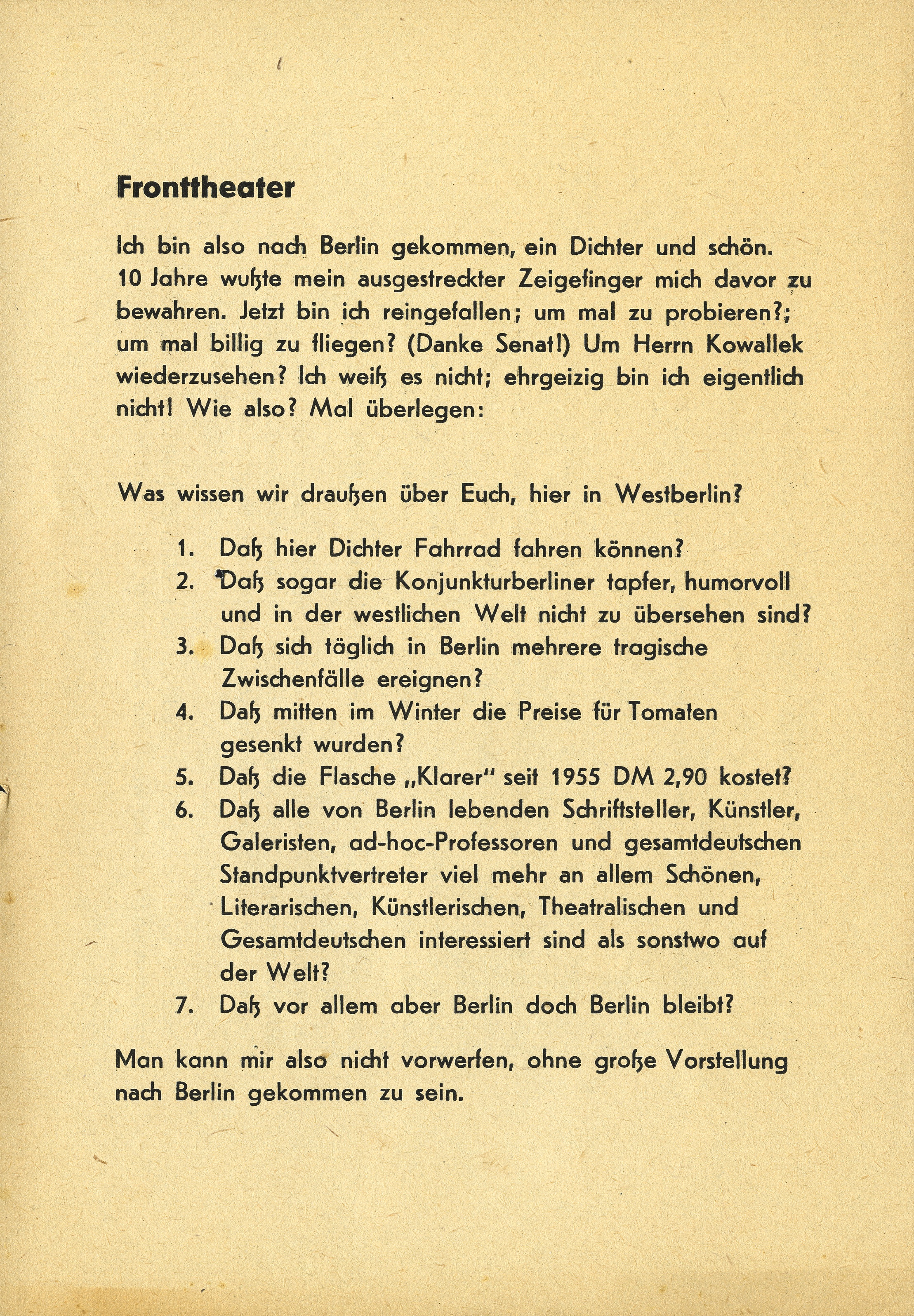 Ich bin also nach Berlin gekommen, ein Dichter und schön. 10 Jahre wußte mein ausgestreckter Zeigefinger mich davor zu bewahren. Jetzt bin ich reingefallen; um mal zu probieren?; um mal billig zu fliegen? (Danke Senat!) Um Herrn Kowallek wiederzusehen? Ich weiß es nicht; ehrgeizig bin ich eigentlich nicht! Wie also? Mal überlegen: