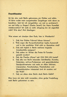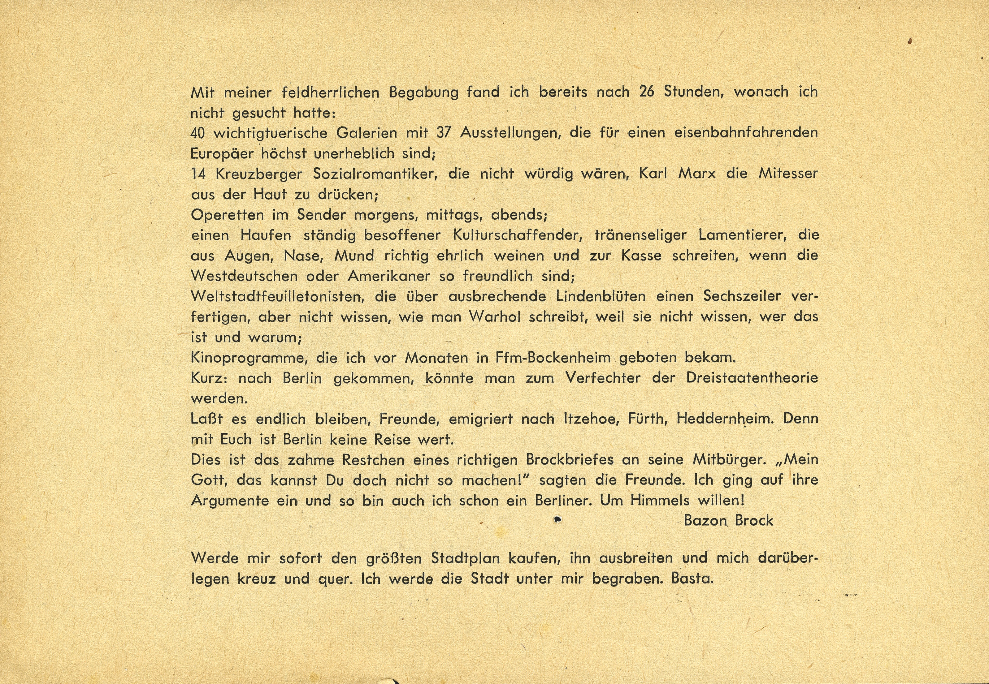Dies ist das zahme Restchen eines richtigen Brockbriefes an seine Mitbürger. "Mein Gott, das kannst Du doch nicht so machen!" sagten die Freunde. Ich ging auf ihre Argumente ein und so bin auch ich schon ein Berliner. Um Himmels willen!