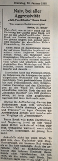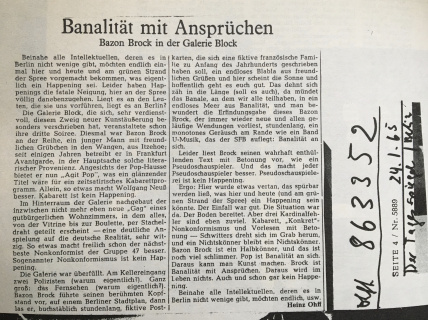 Der Benutzer der Lebensutensilien mußte bei ihrem Gebrauch entweder große persönliche Opfer bringen, um dem Springer'schen Motto zur Durchsetzung zu verhelfen, oder aber durch Niederreißen des Stacheldrahts in seinem Wohnzimmer eingestehen, daß man eben nicht immer daran denken kann und darf. Da die Besucher des Bloomsdays und der Galerie Block keine mottogläubigen BILD-Leser (sondern nur normale BILD-Leser) waren, ließ sich über die Aussagekraft und Verwendungsmöglichkeit dieses theoretischen Objekts nicht mehr sagen, als daß es ein einigermaßen amüsantes Beispiel dafür sei, wie man "Banalität mit Anspruch" verkauft (so Heinz Ohff, dem von Kowallek daraufhin das O in seinem Namen aberkannt wurde, so daß dieser außerordentlich typische deutsche Kulturschreiber bis auf den heutigen Tag als bloßer flatus vocis, als Mundfurz -hfff, anzusprechen ist).“ (ÄV, S. 814)