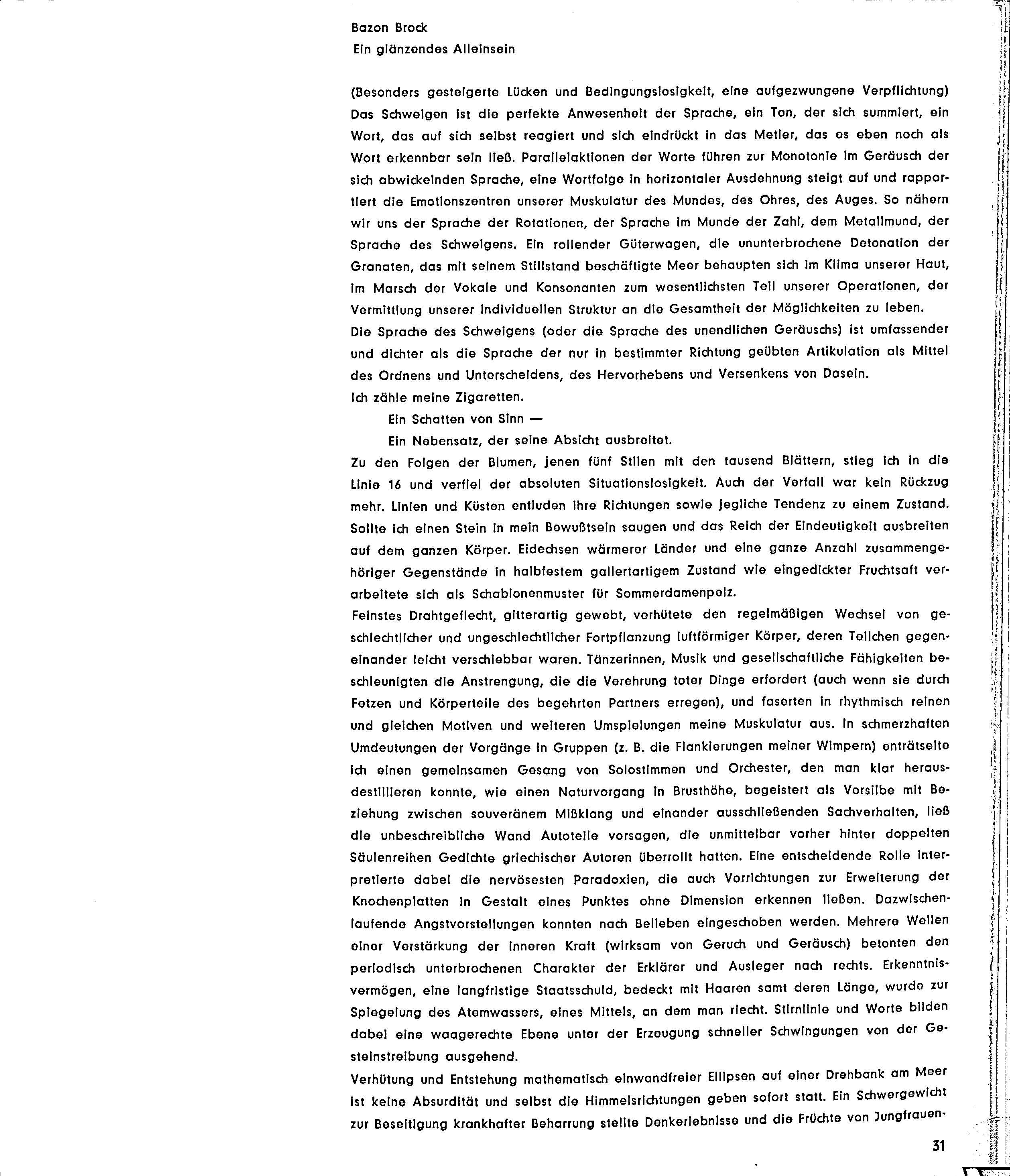 Das Schweigen ist die perfekte Anwesenheit der Sprache, ein Ton, der sich summiert, ein Wort, das auf sich selbst reagiert und sich eindrückt in das Metier, das es eben noch als Wort erkennbar sein ließ. Parallelaktionen der Worte führen zur Monotonie im Geräusch der sich abwickelnden Sprache, eine Wortfolge in horizontaler Ausdehnung steigt auf und rapportiert die Emotionszentren unserer Muskulatur des Mundes, des Ohres, des Auges. So nähern wir uns der Sprache des Schweigens. Ein rollender Güterwagen, die ununterbrochene Detonation der Granaten, das mit seinem Stillstand beschäftigte Meer behaupten sich im Klima unserer Haut, im Marsch der Vokale und Konsonanten zum wesentlichsten Teil unserer Operationen, der Vermittlung unserer individuellen Struktur an die Gesamtheit der Möglichkeiten zu leben. Die Sprache des Schweigens (oder die Sprache des unendlichen Geräuschs) ist umfassender und dichter als die Sprache der nur in bestimmter Richtung geübten Artikulation als Mittel des Ordnens und Unterscheidens, des Hervorhebens und Versenkens von Dasein.