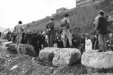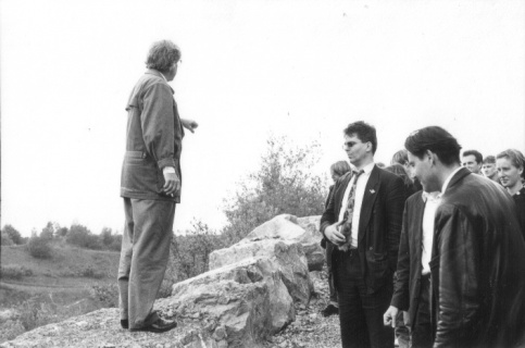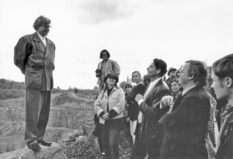 „Gemeinsam mit einigen Kollegen aus dem wissenschaftlichen Bereich, darunter Dietmar Kamper, Beat Wyss und Friedrich Kittler, bearbeitete ich 1991 in dem action teaching „Wir geben das Leben dem Kosmos zurück“ das Vorstellungsfeld einer Theorie der irdischen Lebensentstehung. In einer Wuppertaler Kiesgrube, in der auch der Neandertaler gefunden wurde, trafen zahllose Studenten ein, und gemeinsam schleuderten wir das Leben zurück ins All. Auf dem Film zu der Aktion sieht man deutlich das Streben der Künstler dokumentiert, sich erinnerbar werden zu lassen mit ihrem Werk. Die beschleunigten Prozesse sind zu sehen, wie auch berühmte Denkbewegungen versinnbildlicht sind. Denn mit dem Wurf des mit Lebensspuren imprägnierten Stein, ist nicht nur ein Bezug zur so genannten Lebensspurtheorie hergestellt, nach der aus dem Weltraum kleine Meteoriten bei uns einschlugen, die imprägniert waren mit Lebensspuren, sondern zugleich bezieht man sich auf Adorno, der bereits über die Fallkurve eines geworfenen Steines Denkbewegungen auslöste.“